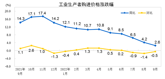2022年9月份,全国工业生产者出厂价格同比上涨0.9%,环比下降0.1%;工业生产者购进价格同比上涨2.6%,环比下降0.5%。1—9月平均,工业生产者出厂价格比去年同期上涨5.9%,工业生产者购进价格上涨8.3%。